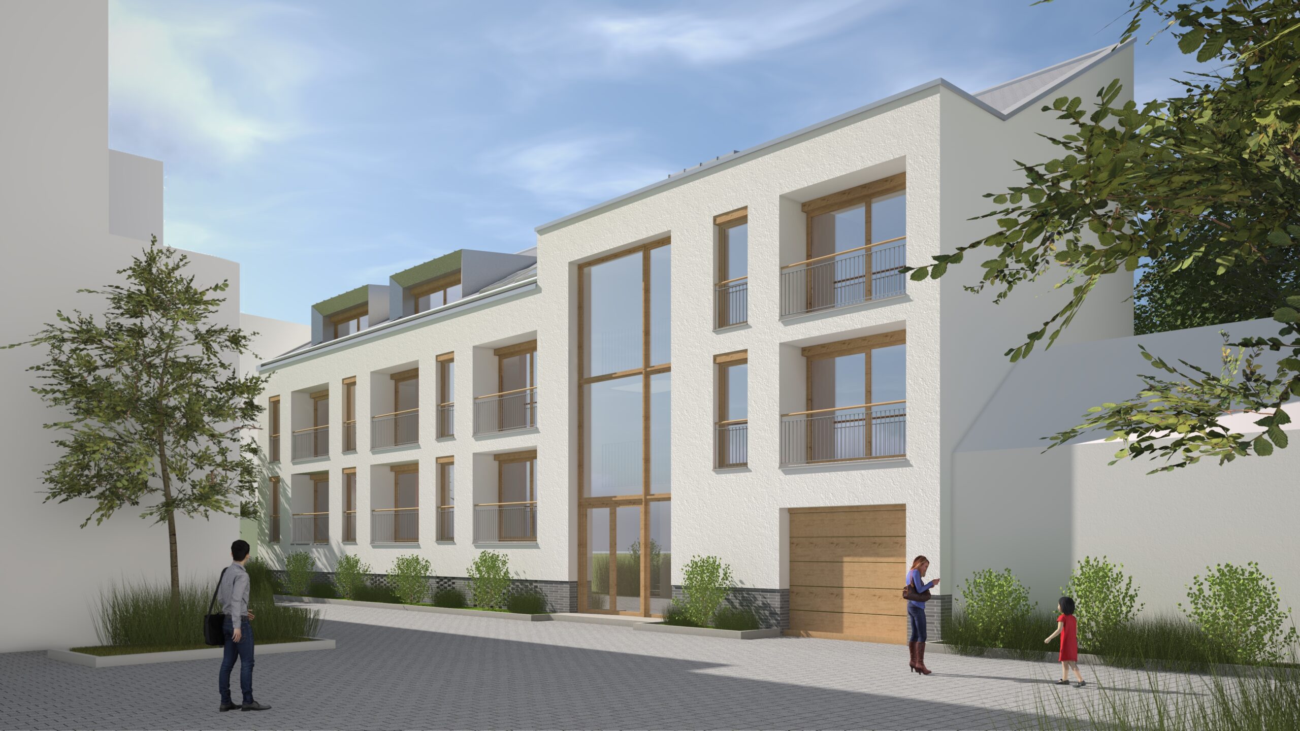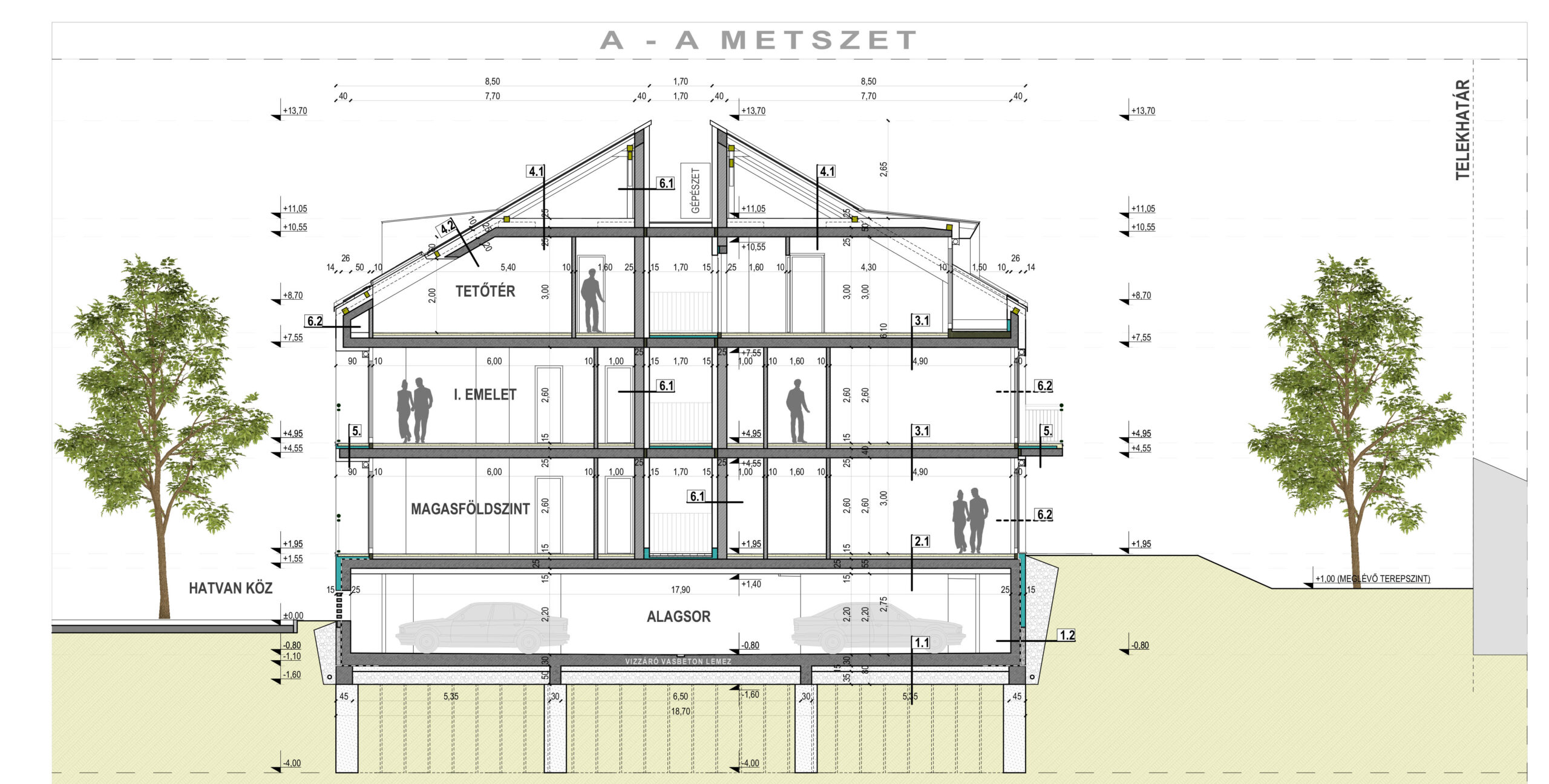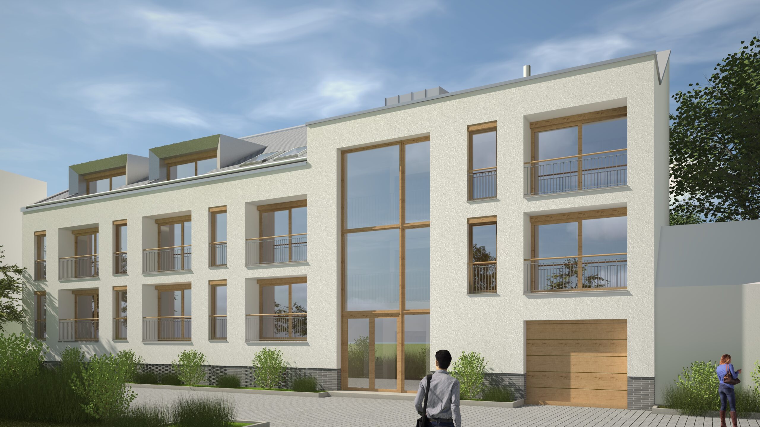 A tervezésénél alapvető szempont volt egy hagyományos megjelenésű, tiszta rendszerű épület létrehozása. A lakásegységet két különálló épülettömegben helyeztük el, melyeket a közlekedő, könnyed lapostetős tömege köt össze.