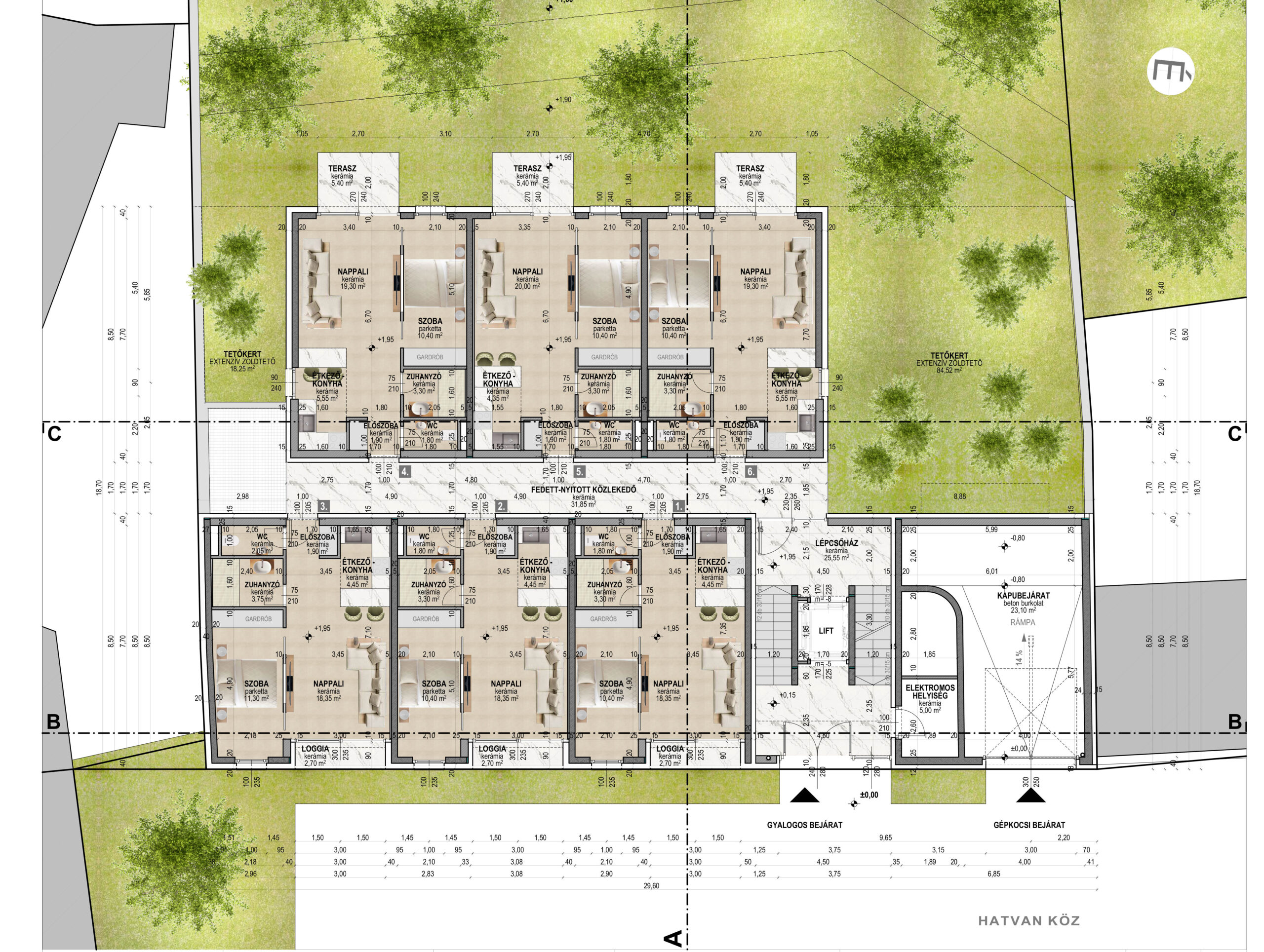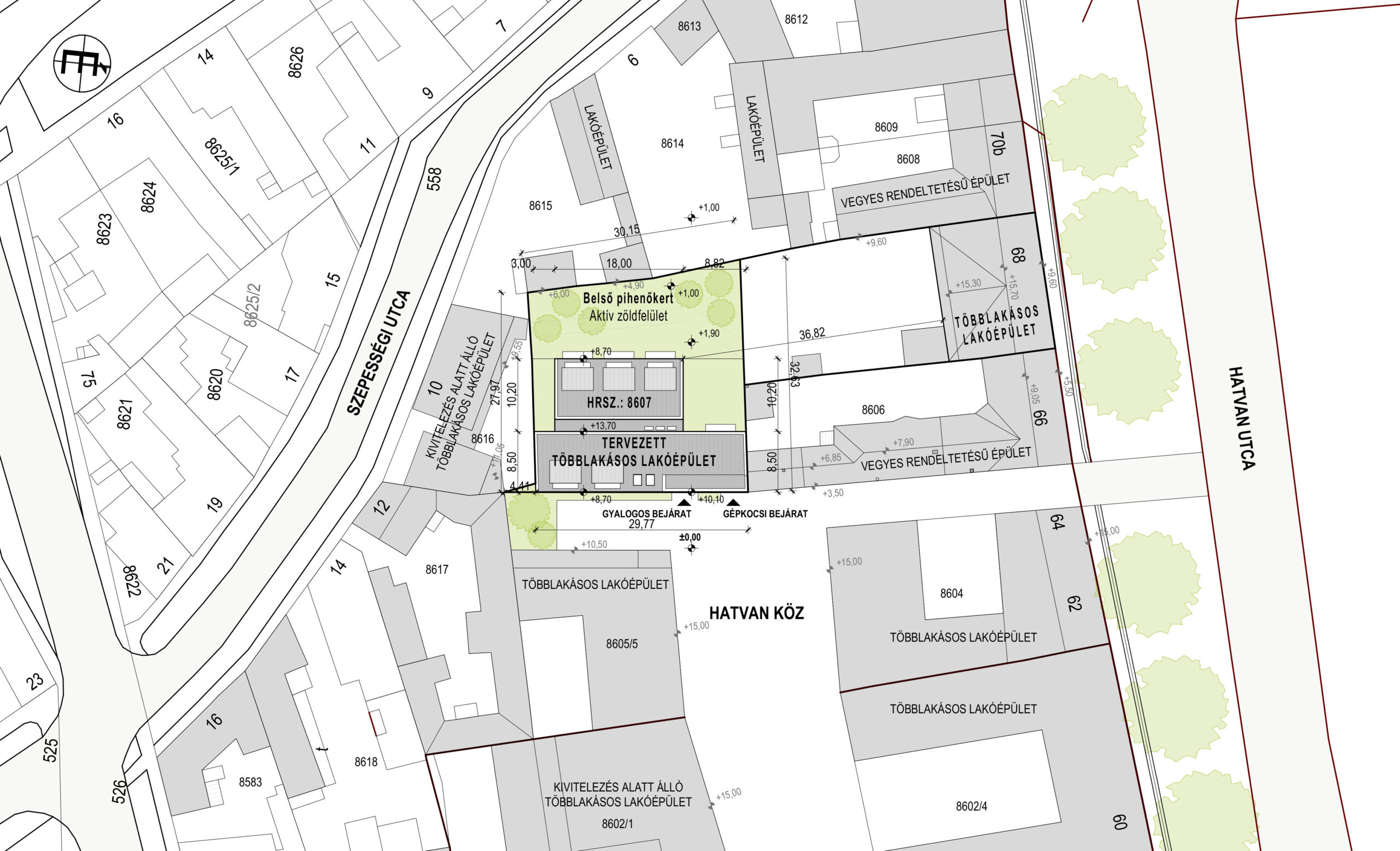 A tervezési terület Debrecen belvárosában található, a Hatvan utcából nyíló, újonnan kialakuló tömbbelsőben, a Hatvan közben. A tömbbelsőben az elmúlt években társasház fejlesztések történtek. A tervezéssel érintett ingatlan a Hatvan köz Szepességi utca felőli oldalán található, így átmenetet képez a nagyvárosi léptékű társasházak és lakó- és kistársasházas, magastetős karakterű városrész között.