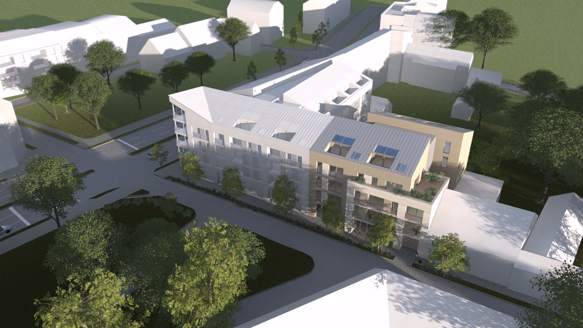 Az épületet a körút és a Jókai utca beépítéséhez illeszkedően, zártsorú épülettömegekkel terveztük. A tömegalakításánál az építési telek lépcsőzetes kialakításának adottságát vettük alapul. Az épület két félnyeregtetős tömegből áll, lépcsőzetes tömeg alakítása biztosítja a Jókai utcán a további, alacsonyabb párkánymagasságú épületetek csatlakozását. Az épülettömegek egy középső tágas közlekedő köré szerveződnek.