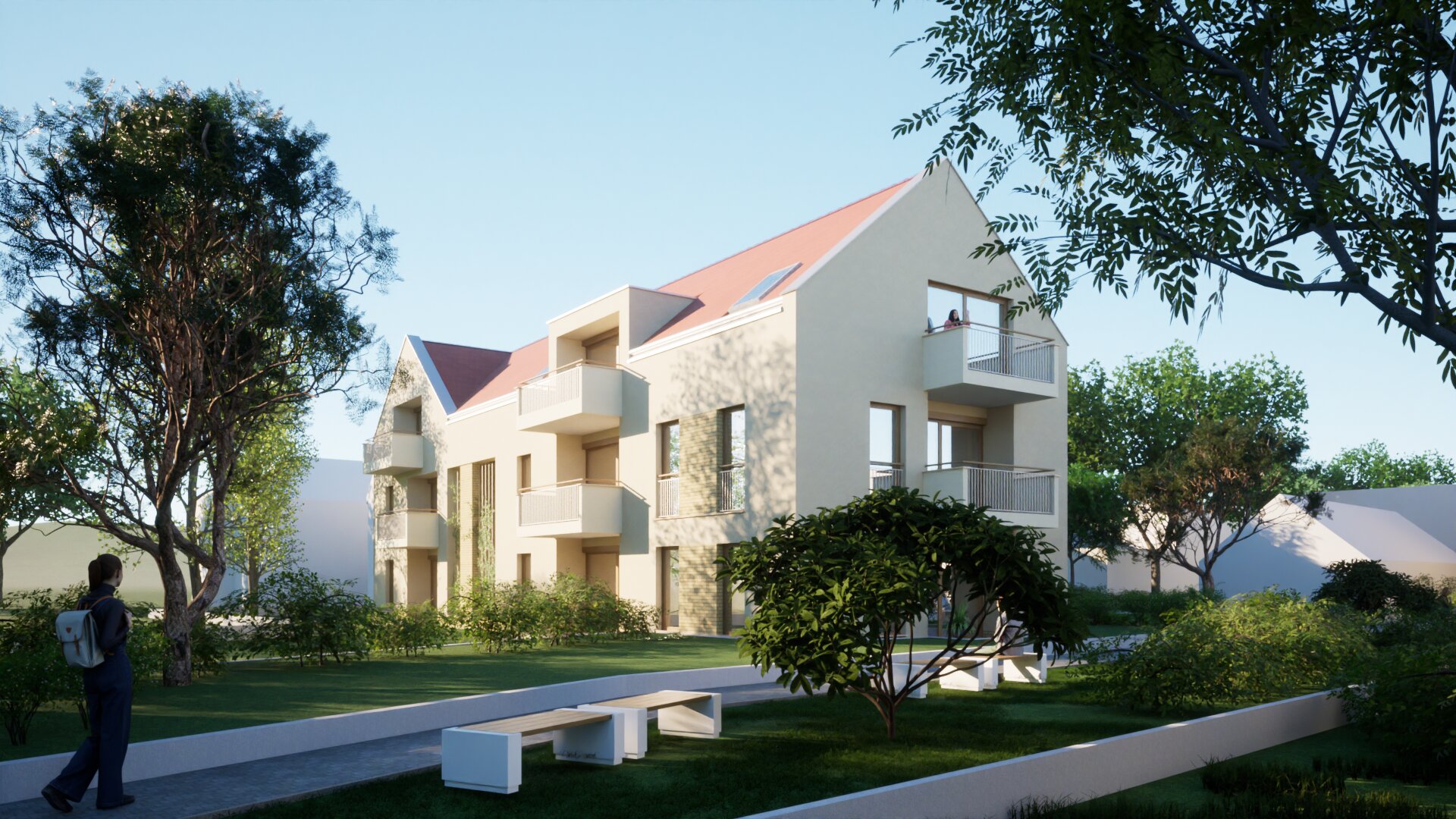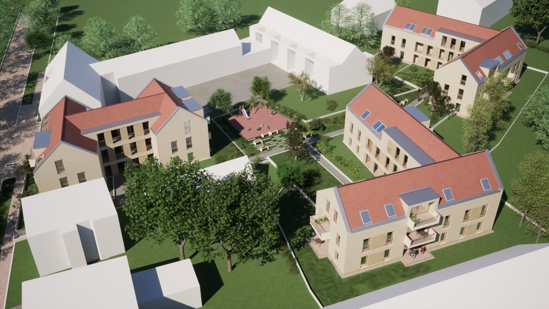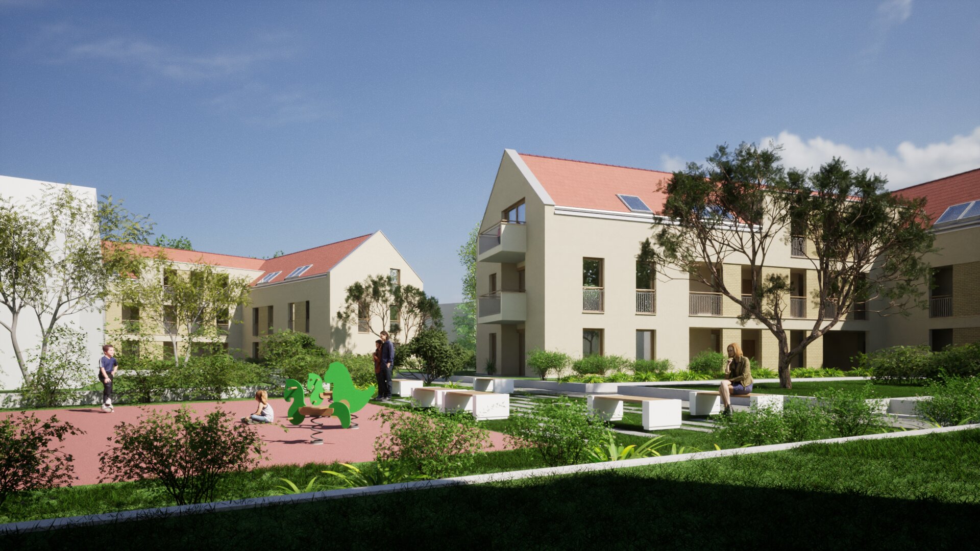 A lakóépületeket a földszinten gyalogos sétány köti össze, biológiailag aktív zöldfelületekkel, közösségi térrel, és játszótérrel. A három különálló lakóépület hagyományos, magastetős tömegformálású, amelynek intenzitása illeszkedik a kisvárosi környezethez. Az épületek telepítésénél megfelelő távolságot tartottunk, így szellős jól használható belső pihenőpark jön létre.
