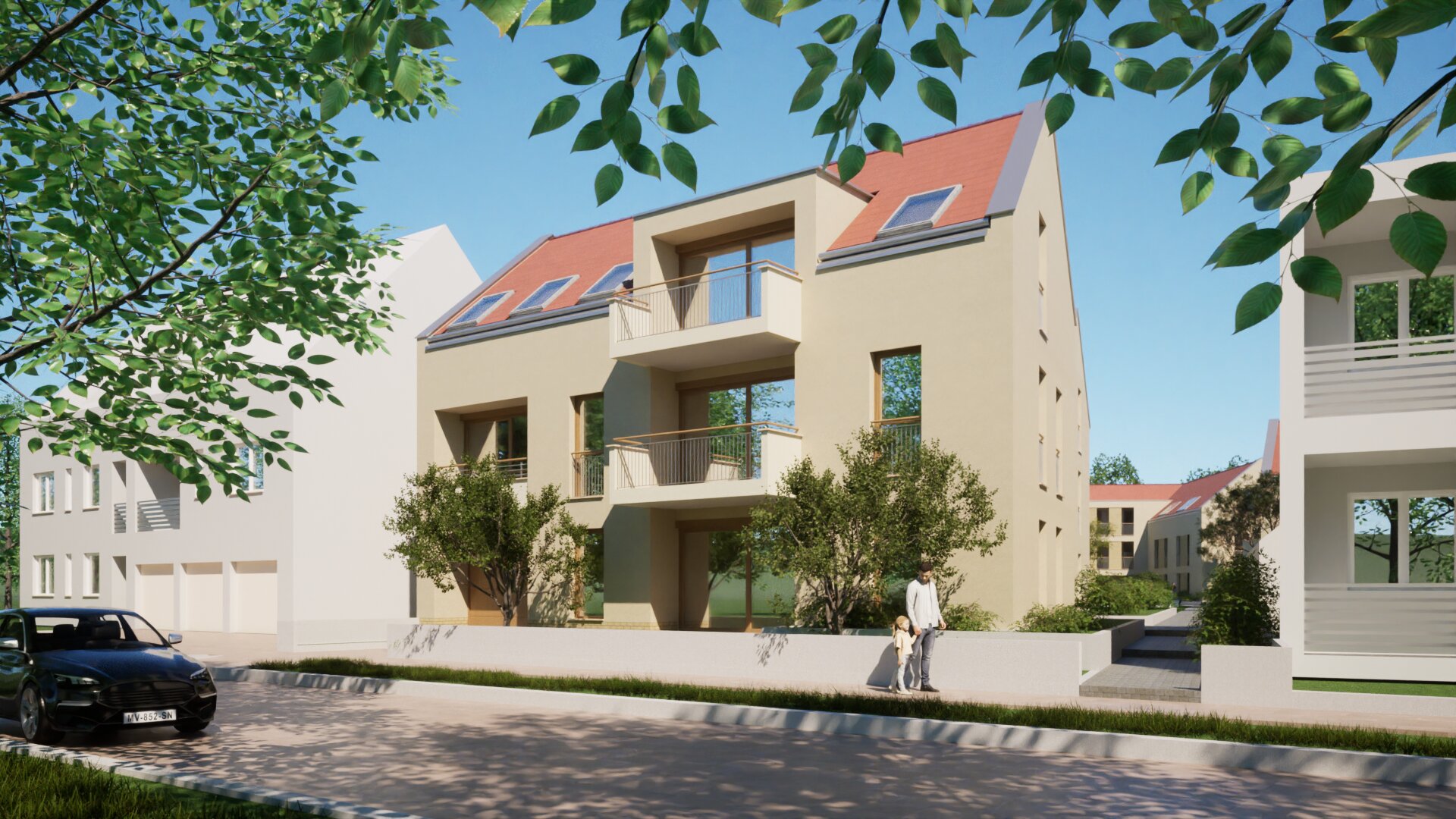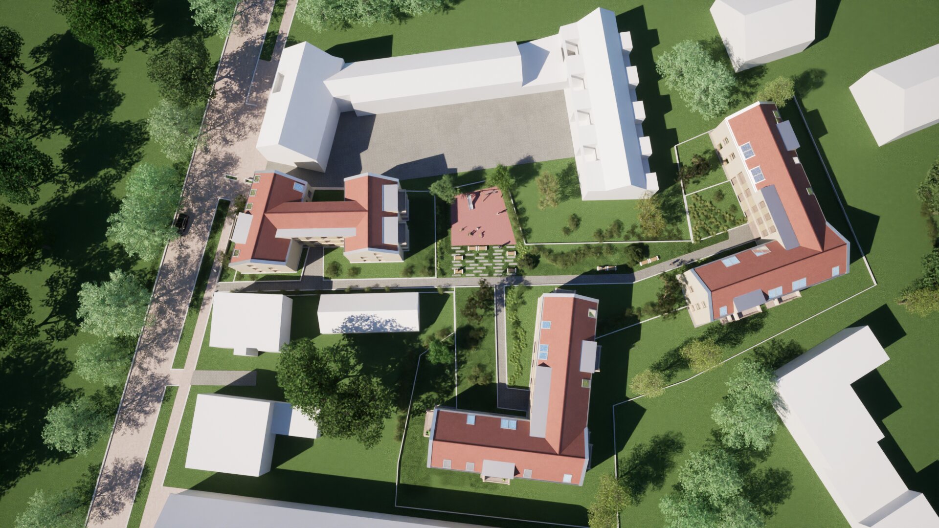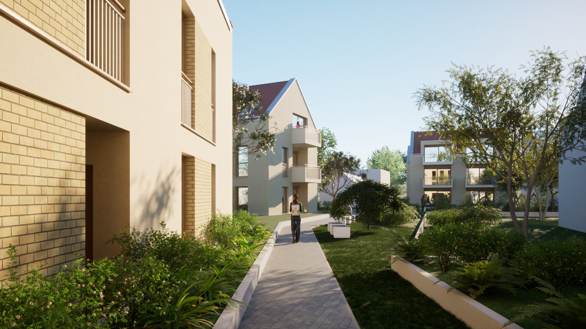 A lakóépületeket a földszinten gyalogos sétány köti össze, biológiailag aktív zöldfelületekkel, közösségi térrel, és játszótérrel. A három különálló lakóépület hagyományos, magastetős tömegformálású, amelynek intenzitása illeszkedik a kisvárosi környezethez. Az épületek telepítésénél megfelelő távolságot tartottunk, így szellős jól használható belső pihenőpark jön létre.